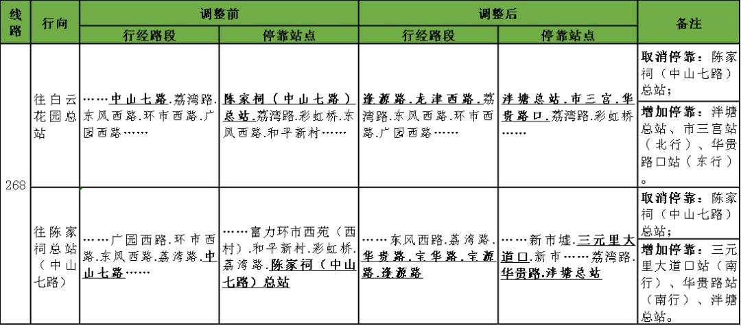调整公共汽车268路由公共汽车陈家祠(中山七路)总站改为公共汽车泮塘总站运作,并取消停靠公共汽车陈家祠(中山七路)总站,增加停靠公共汽车泮塘总站、市三宫站(北行)、华贵路口站(东行)等站点。